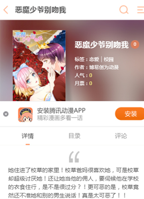 简介: 漫画《恶魔少爷别吻我》简述:根据同名小说《恶魔少爷别吻我》所改编!他是全校最受欢迎的帅哥,长相英俊,家世丰厚!可偏偏自己阴差阳错的住进了校草的家中?!并且校草的爸爸妈妈都还很喜欢她!可是校草却超级讨厌她!还让她当他的佣人,要伺候他在学校的衣食住行,是不是很过分?!更可恶的是,校草竟然还不准她和别的男生说话!真是太可恶了!!